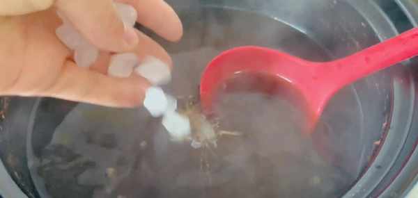 这个时候的绿豆是微微要开的状态,其实有很多小宝宝不喜欢喝绿豆汤,这个时候我们可以往里面加入适量的冰糖搅拌一下,盖上盖子再继续煮上五分钟,把冰糖煮至融化