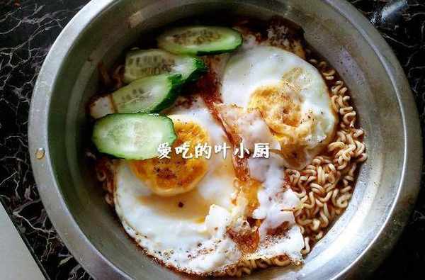 3.泡面泡好后,把煎好的鸡蛋放在泡面上,再放些黄瓜片提味,一碗好吃又营养的泡面就做好了。