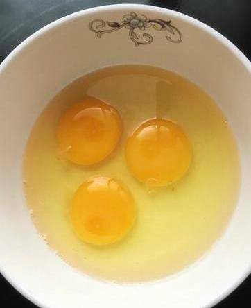 接下来准备个稍微大点的碗,把六个鸡蛋全部打入碗里,在打鸡蛋的时候动作稍微轻一点,正常情况下,如果是新鲜的鸡蛋打入碗里是不会散的,全部打进去以后先放在一边备用。