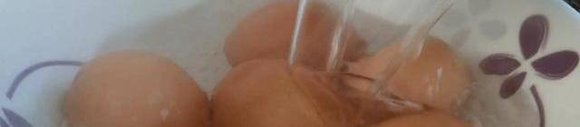 锅里把水烧开,舀出一碗水来,把开水直接倒入洗干净的鸡蛋里面浸泡一分钟,这样能让鸡蛋液的表面稍有一点点凝固,鸡蛋在下锅的时候就不容易散,一分钟以后再把鸡蛋捞出来,放在一边备用。