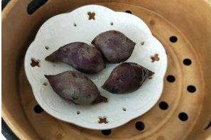冲洗干净紫薯,蒸熟紫薯。(蒸25分钟左右)。