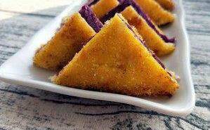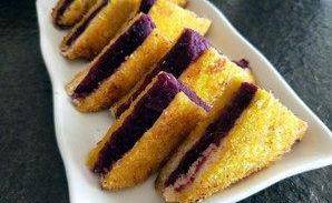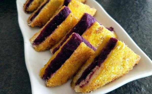 将烤面包放在桌上,切边,把准备好的紫薯泥均匀地抹一片吐司,盖上另一片(两组),用蛋液均匀地蘸吐司,然后用面包糠(没有面包糠也没事)涂在每一面。
