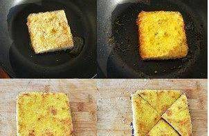 在平底锅里刷一些油,把准备好的面包.用低火煎至两边金黄,取出面包片,斜切两把(如图所示)。