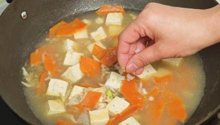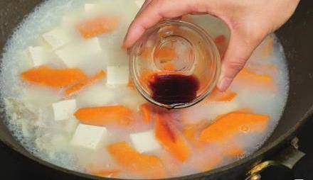5水开后加入南瓜和豆腐、盐、生抽,小火慢炖。