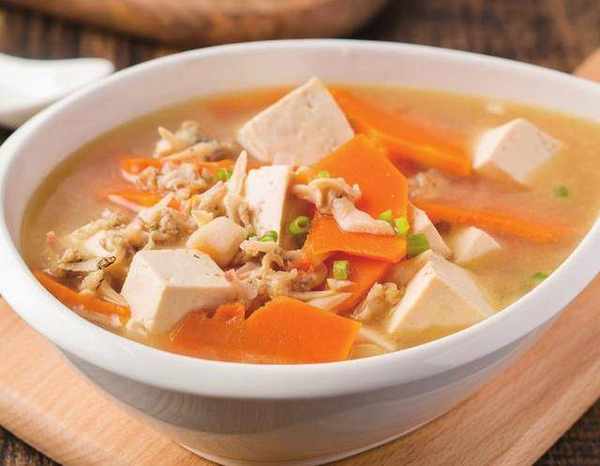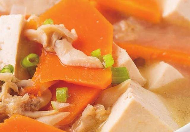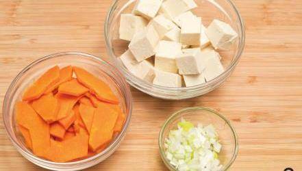 准备材料:蛤蜊肉100克,珧柱100克,南瓜200克,豆腐250克,植物油50毫升,盐1/2茶匙,生抽1/2汤匙,葱1节