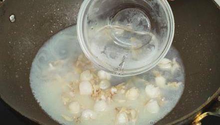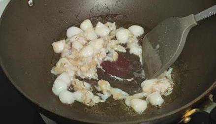 3坐锅倒油,油热后将蛤蜊肉和珧柱下锅翻炒。