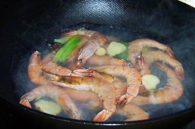 接下来我们就需要大火把水烧开,并且转为小火让它微微的冒泡,这样的时候我们就需要把这个大虾给放进去,利用这个微微冒泡的水温,把这个大虾给煮熟煮到变红,并且变得弯曲就可以捞出来了。