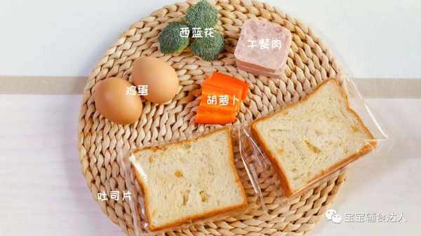 午餐肉、吐司芯,依次地盖到蔬菜之上。