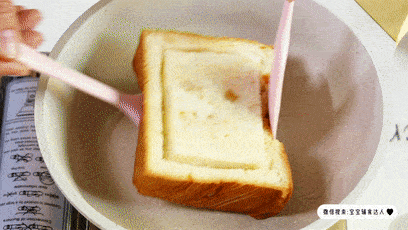 小火给三明治烙到底面微黄,就给它翻个面。如果感觉翻面有点困难,就用两个铲子翻,不容易翻车。