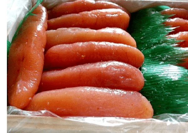 这些看起来像香肠的东西实际上是一袋鳕鱼子,经过腌制并添加了香料。一层薄薄的皮膜将所有的鳕鱼卵放在一起,生吃时味道很咸。