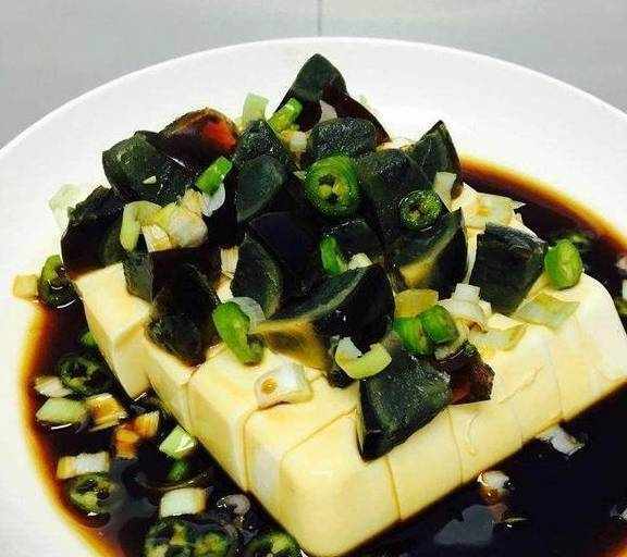 皮蛋3只、日本豆腐2个、辣椒油5g、盐1.5g、芝麻1小勺、香葱2根、红椒适量、蚝油1小勺、糖3g、海鲜酱油2小勺。