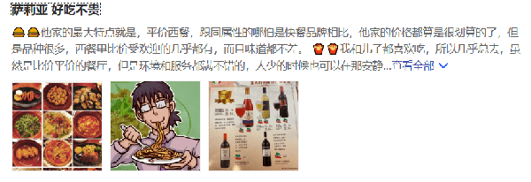 两年前她开始在萨莉亚打工,打工期间了解到萨莉亚是怎样做到性价比这么高的,而且每道菜都好吃。菜品的物美价廉,免费使用丰富的调味料,加上精美的店内装饰和美好的经营理念,这一切对她来说都充满魅力,让她陷入了萨莉亚的沼泽。她每周最多去8次萨莉亚,最少3次。