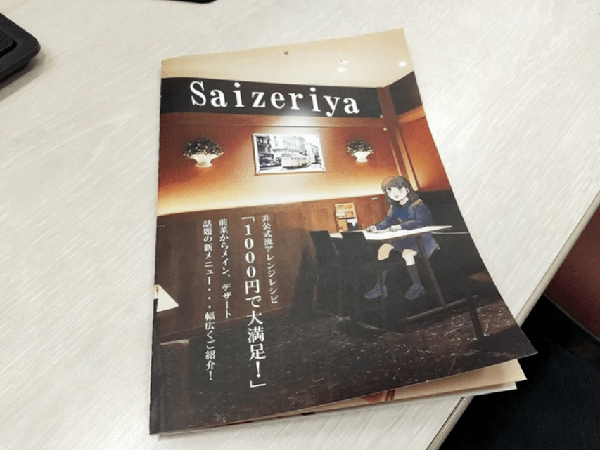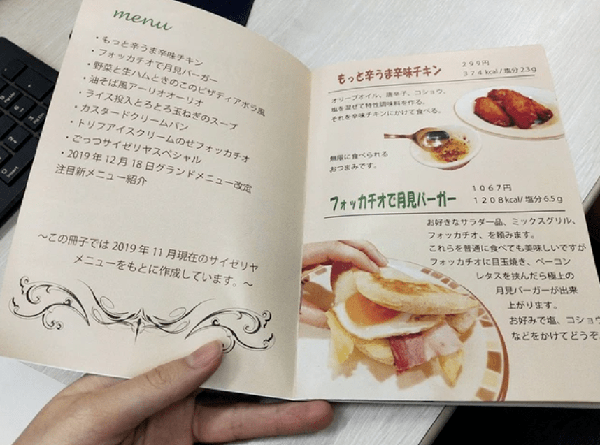 萨莉亚是日本氛围轻松能享受意大利料理的家庭餐厅。宣传册中有8种将多个菜单和香料的组合后完成的综合菜单,除此之外也写上了金额、卡路里和含盐量。制作者如此讲究,满满的都是制作者对萨莉亚的爱。