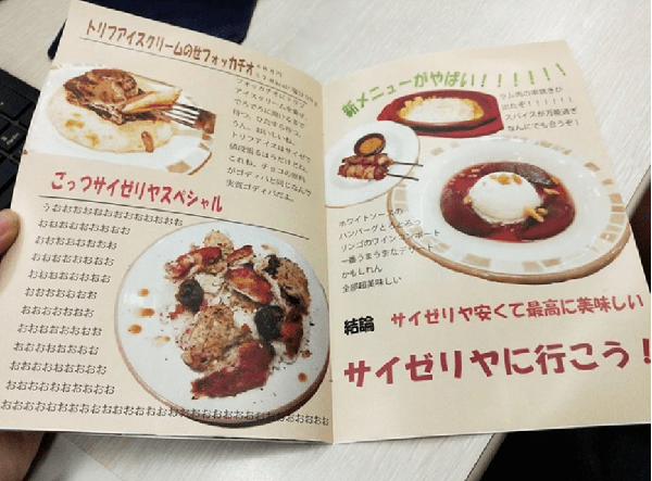 萨莉亚非官方账号桑(@muritotoi)在推特发文:“我在学校的课题上制作了萨莉亚的宣传册。把我最喜欢的菜单综合整理进去了,大家看看吧!”