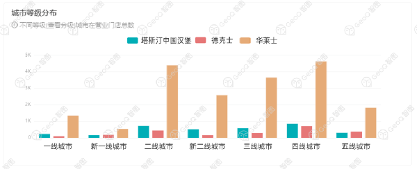 三个品牌门店的城市等级分布十分相似,均在四线城市的门店最多,其次是二线城市。在一线城市和新一线城市的门店数较少。