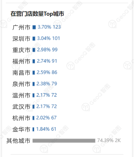 截至今年3月8日,塔斯汀在广州市的在营门店最多,其次是深圳和重庆,各个城市的门店数差距不大,分布相对均匀。