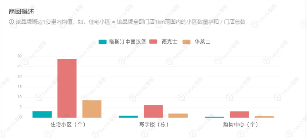 对比三个品牌门店周边配套情况,德克士平均每家门店周边1公里的住宅小区、写字楼以及购物中心最多,选址地段相对繁华。