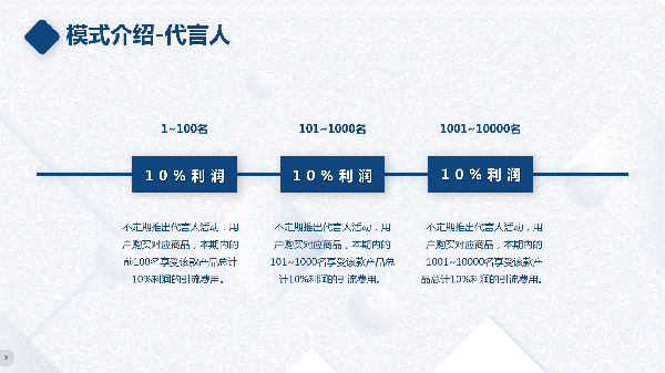 我们设立了代言人产品,按购买先后顺序进行分红,没有任何门槛,只需要购买我们的产品即可。例如,前100名代言人可获得总分红的10%。