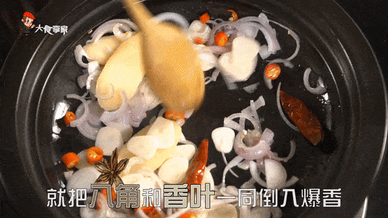 3.锅中热油把刚刚切好的配料全部放入锅中爆香炒到整个厨房都散发着香味的时候,再加入八角和香叶炒一炒