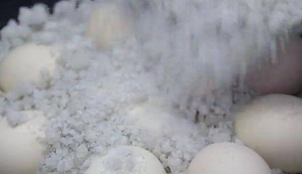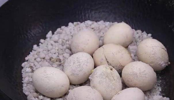 中途要每隔几分钟把底下的盐铲到上面来,让鸡蛋可以均匀受热。25分钟后鸡蛋完全就熟了,再把鸡蛋外壳敲裂,闷得越久越入味。接下来咱们把鸡蛋扒拉出来,现在剥去外壳就可以吃了。