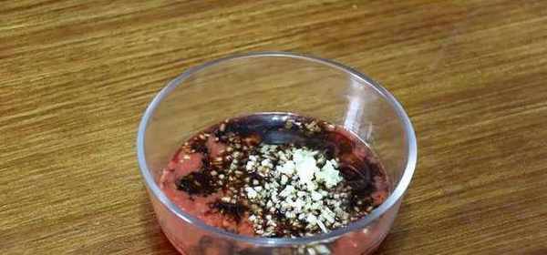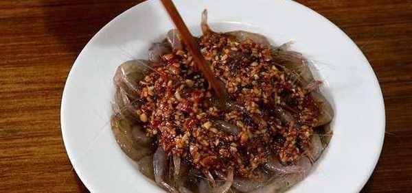 调好的汁淋在醉好的小白虾上,放入蒜末和姜末搅拌均匀。