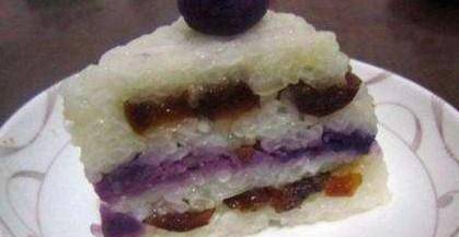 将糯米淘洗干净,用清水浸泡三十分钟。将浸泡后的糯米放入电饭锅中,加入清水,水量刚刚没过糯米就可以了,蒸熟后取出。取一个八寸大小的慕斯框,用锡纸包住底部,倒入一层糯米饭,压实。在糯米饭上面铺上一层红豆沙,再次压实,然后再铺一层糯米饭。放在蒸锅中蒸10分钟,取出切块,撒上一些桂花,淋上蜂蜜,食用即可。