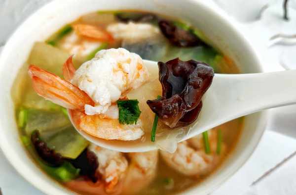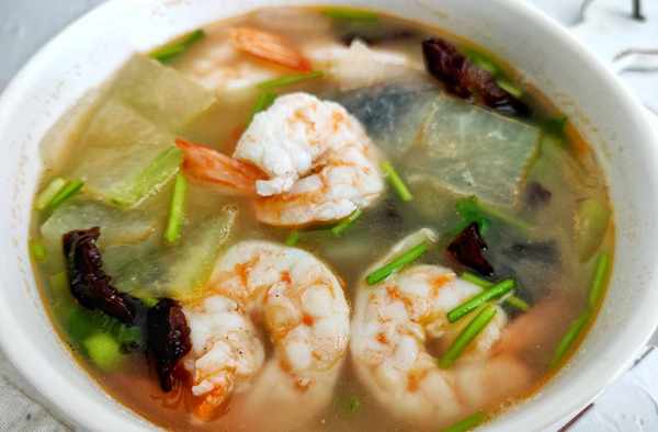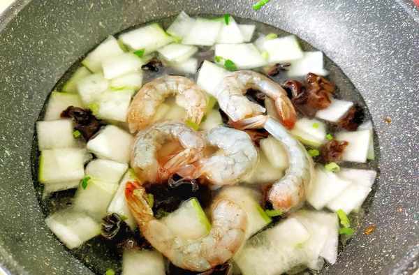 冬瓜一斤,虾六个,葱一根,香菜一根,盐适量,胡椒粉少许,木耳适量