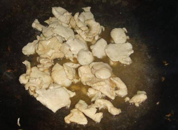 我们起锅热油炒生姜,我们把适量生姜炒出生姜的香味,然后放入我们之前处理好的鸡肉,用大火煸炒,生姜能够去除鸡肉的腥味,煸炒能够改善鸡肉的肉质,让我们吃的时候不会感觉那么老,等水分都炒干。