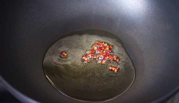 4. 接下来我们需要起锅烧油,倒入适量的花生油,油温热的时候需要把花浇到肉里边,慢慢的炸出香味之后,就可以把花椒捞出来扔掉。