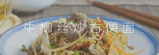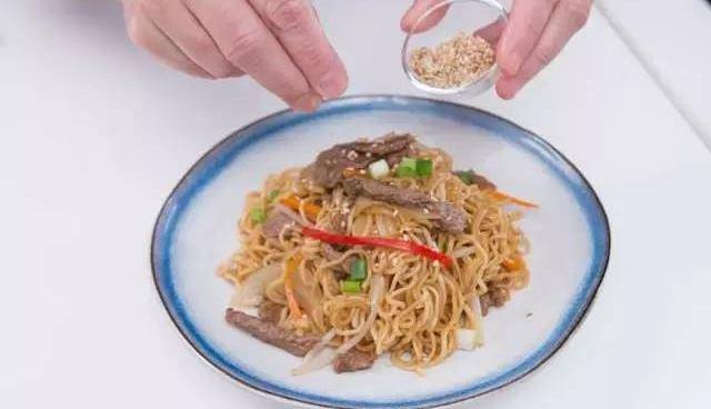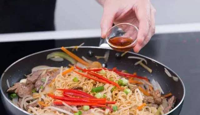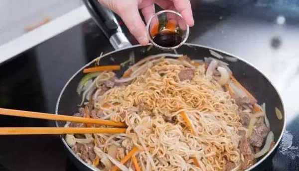 7、加入牛柳及方便面炒匀,加入生抽、老抽拌匀;