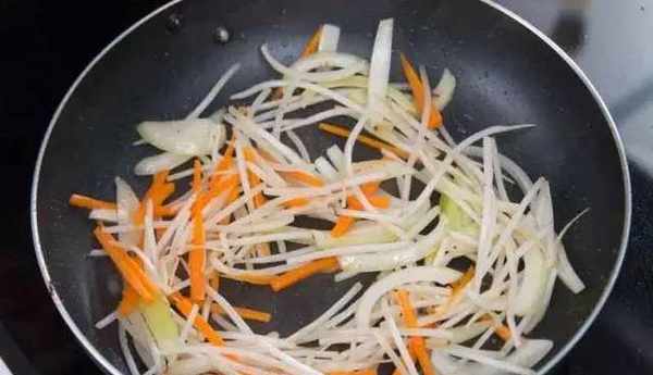 6、用同一个锅,加少许油,加入洋葱、红萝卜及豆芽快炒;
