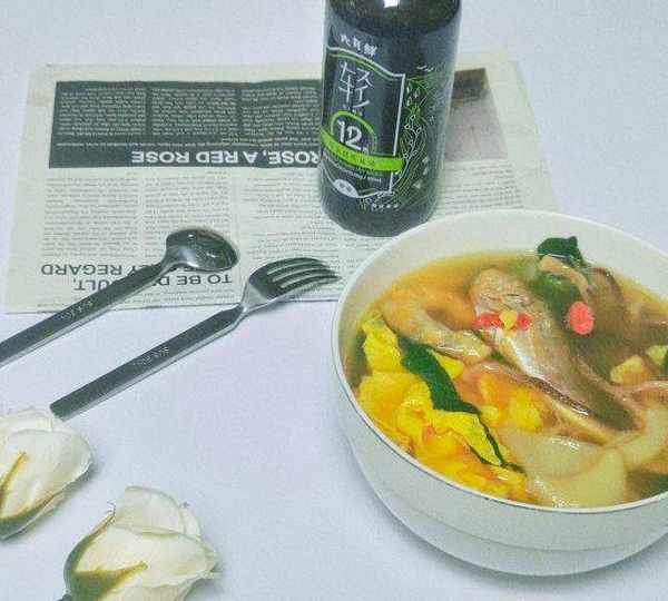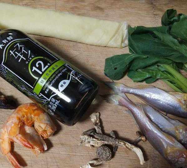 原料:番薯蛋皮、鹿茸菇、虾干、小黄鱼、青菜、腊肉、六月鲜轻盐昆布酱油。