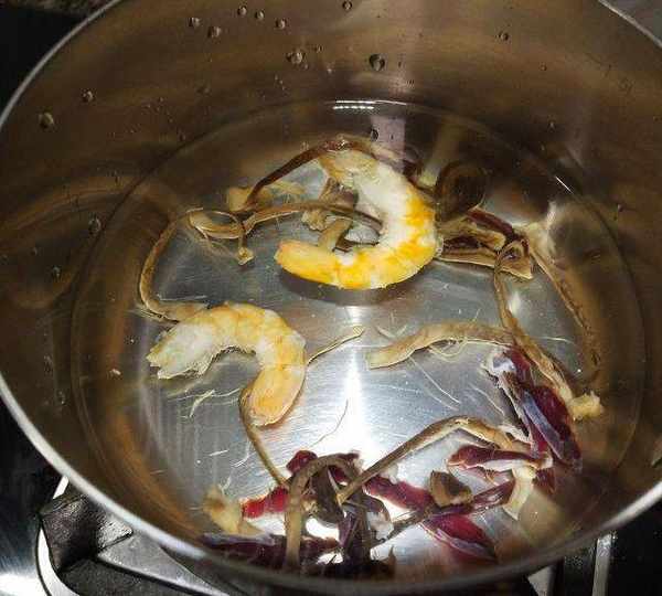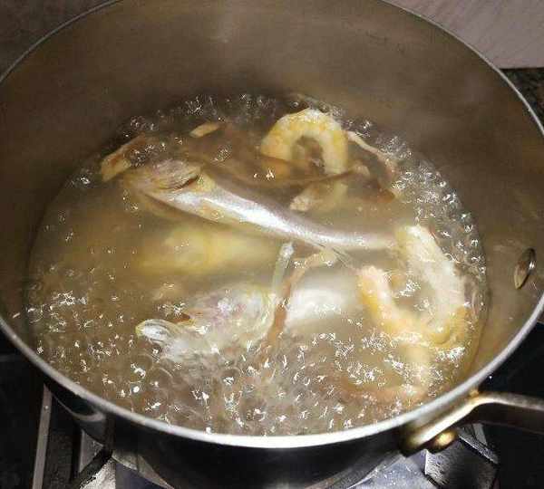 第6步、锅里放入鹿茸菇,腊肉勺和虾干,放入适量的水烧开,再烧一会。