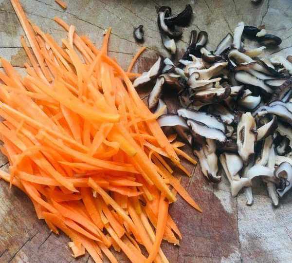 第1步、胡萝卜切细丝,泡好的香菇洗净泥沙,从中间剖开,尽量切细一些。