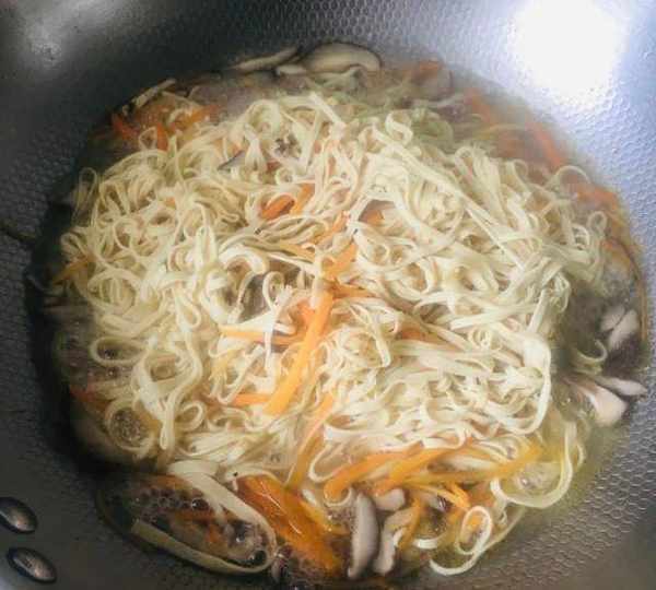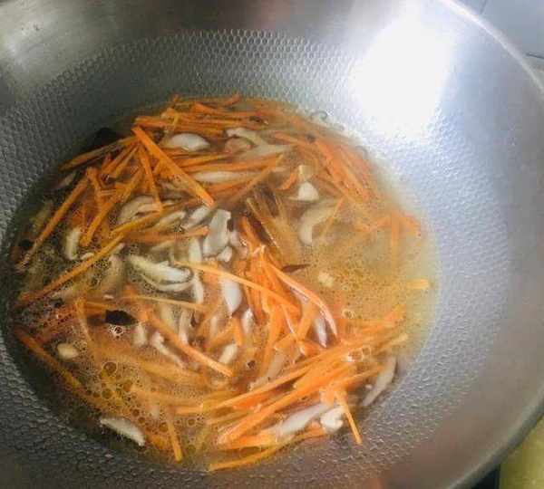 第7步、放入香菇丝、胡萝卜丝煮两分钟。