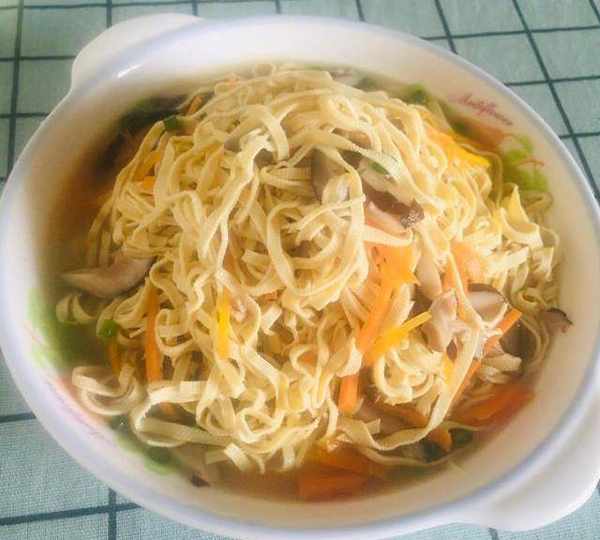 原料:豆腐皮丝、胡萝卜、香菇丝、鸡汤、胡椒粉。