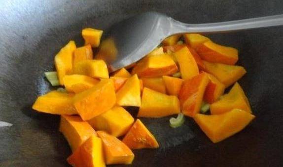 3、锅中倒入适量的食用油,当油烧热之后,然后先放入切好的姜片,炒出香味之后,然后再将切好的南瓜倒入锅中翻炒一会儿。