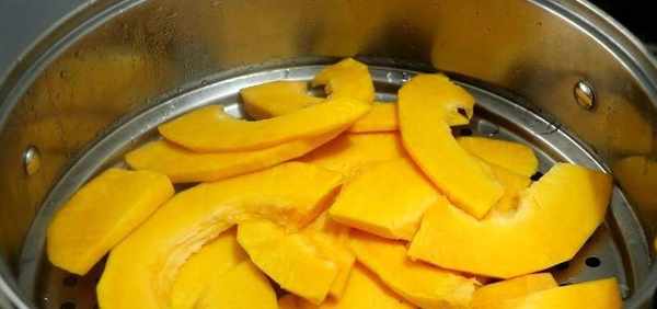 把切好的南瓜片放入蒸锅上蒸熟,用筷子轻轻一戳,南瓜就能被戳烂的时候就可以出锅了。
