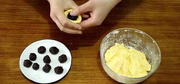 取适量大小的面团,像包汤圆一样把豆沙包进面团里。
