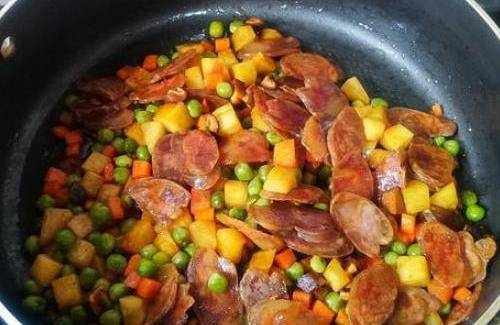 第二步:架锅烧油,下入腊肠,用小火将其煸炒出香味,接着放入土豆、胡萝卜、香菇丁和豌豆粒,继续翻炒一会儿,然后添入适量生抽、老抽和白砂糖进行调味,炒至上色之后便可熄火。