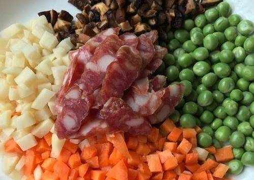 第一步:腊肠冲洗干净斜切成薄片状;干香菇用热水泡发后取出,将其切成小丁状;胡萝卜和土豆洗净后分别削皮,切成小丁块,豌豆剥壳取颗粒,留用。