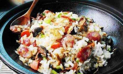 第三步:将大米淘洗干净倒进电饭锅,并添入适量清水,最后将刚才炒好半熟的食材倒进电饭锅中,加上盖子,按煮饭键将其煮熟,一锅腊肠焖饭就这么完成了,又香又美味,超级棒!