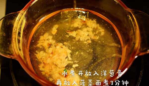 2,煮锅中放水煮开,放入一小勺洋葱膏,然后再放上我们的菠菜面煮三分钟。