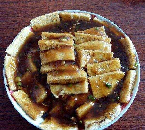 而花生油、生抽、糖与蒸出的豆腐汤汁融在一起,再淋在蒸好的豆腐上,再装饰一些葱丝就做成了。
