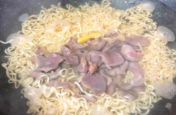 第四步:将煮熟的鸡肾薄片倒入面里,搅拌均匀,加入适量的盐和少许生抽,继续煮2分钟。