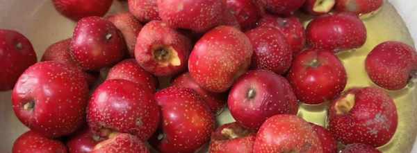 1、首先准备山楂,用热水给它烫3分钟,清洗干净,可以杀菌消毒。