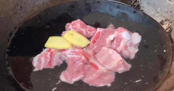 4、将排骨、姜片、料酒下锅去腥,焯水3分钟捞起。