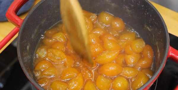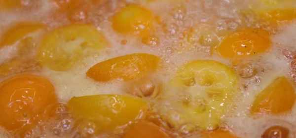 5、再倒入金桔,中火煮,不断搅拌。