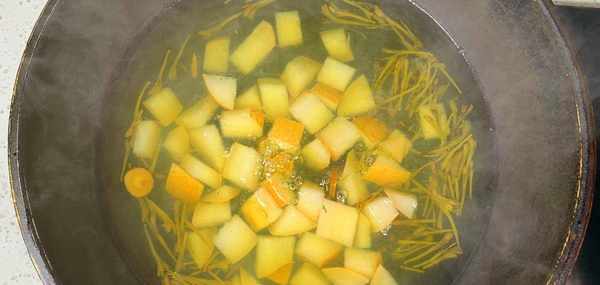 2、准备一个干净的锅,把雪梨块、金银花和甘草都放入锅内,再倒入足够量的清水,把煮锅的盖子扣上,开火煮,在煮的时候先把水用大火煮开,接着改为小火继续煮20分钟,煮出甘草的香味,20分钟后关火就可以。
