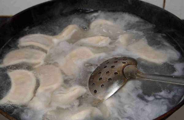 10、在翻动水饺的时候注意要用勺子(漏勺、铲子)等背面靠着水饺,向一个方向推动,不要搅拌,这样极容易把饺子皮划破。